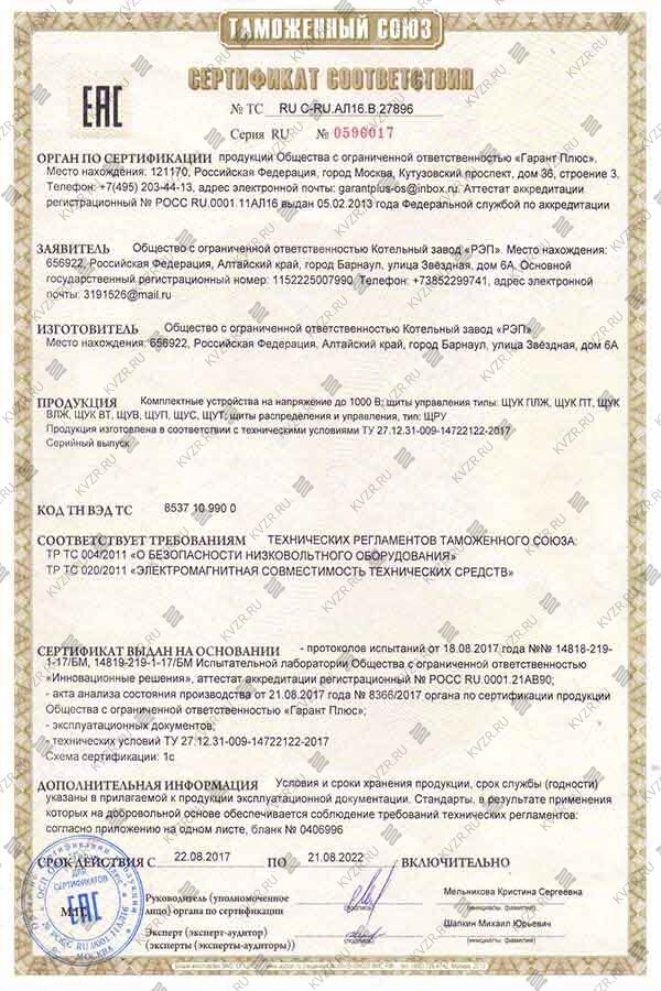 Получен сертификат соответствия на комплектные устройства на напряжение 1000 В: щиты управления типы: ЩУК ПЛЖ, ЩУК ПТ, ЩУК ВЛЖ, ЩУК ВТ, ЩУВ, ЩУП, ЩУС, ЩУТ; щиты распределения и управления, тип: ЩРУ